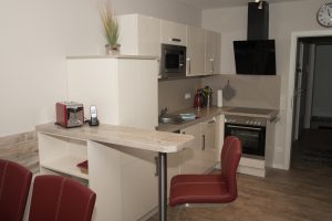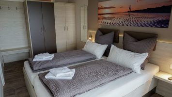 Komfortable Ferienwohnung, 65 qm Wohnfläche, barrierefrei im EG, eignet sich für den Urlaub mit bis zu 4 Personen. Großer, heller und hochwertig eingerichteter Wohnbereich mit komplett ausgestatteter Küchenzeile, zwei Schlafräume sowie ein Abstellraum mit Garderobe, ein Duschbad mit WC und ein Gäste-WC.